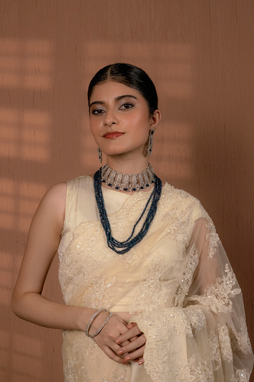 Stainless Steel neckless, earring and bindi set with Rhodium plating with High quality crystals . Tarnish free. Hypo Allergic.