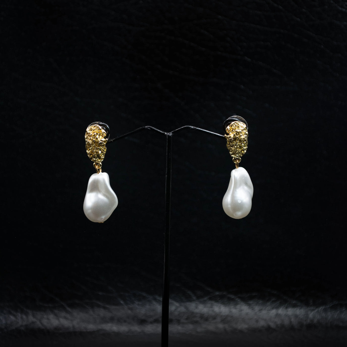 Introducing the Gold and White Pearl Earrings, a masterpiece from the Sovrati Jewelry collection. These exquisite, handcrafted earrings feature a sophisticated and luxurious design, combining textured gold with large, irregularly shaped white pearls. The baroque style of the pearls adds a unique and artistic touch, making these earrings a true statement piece.