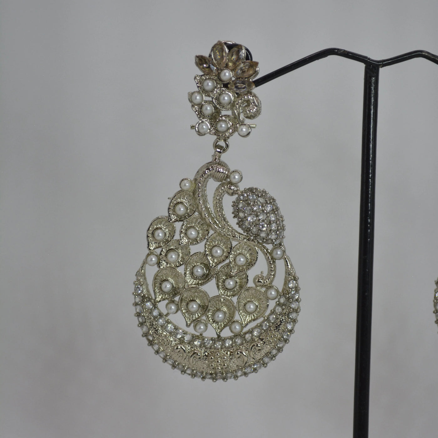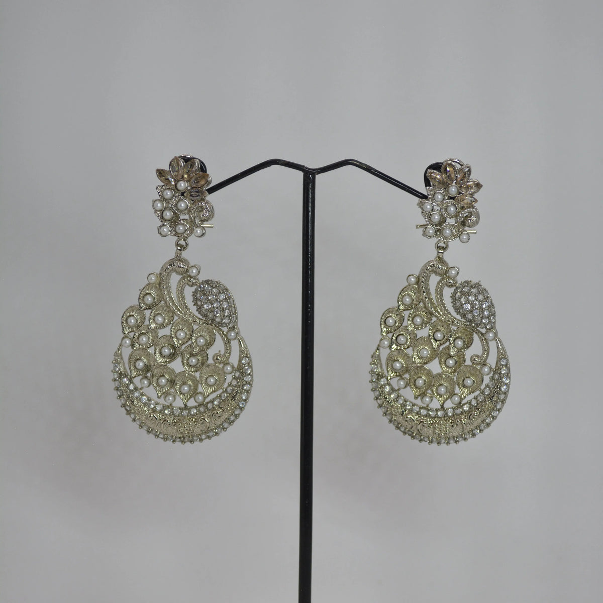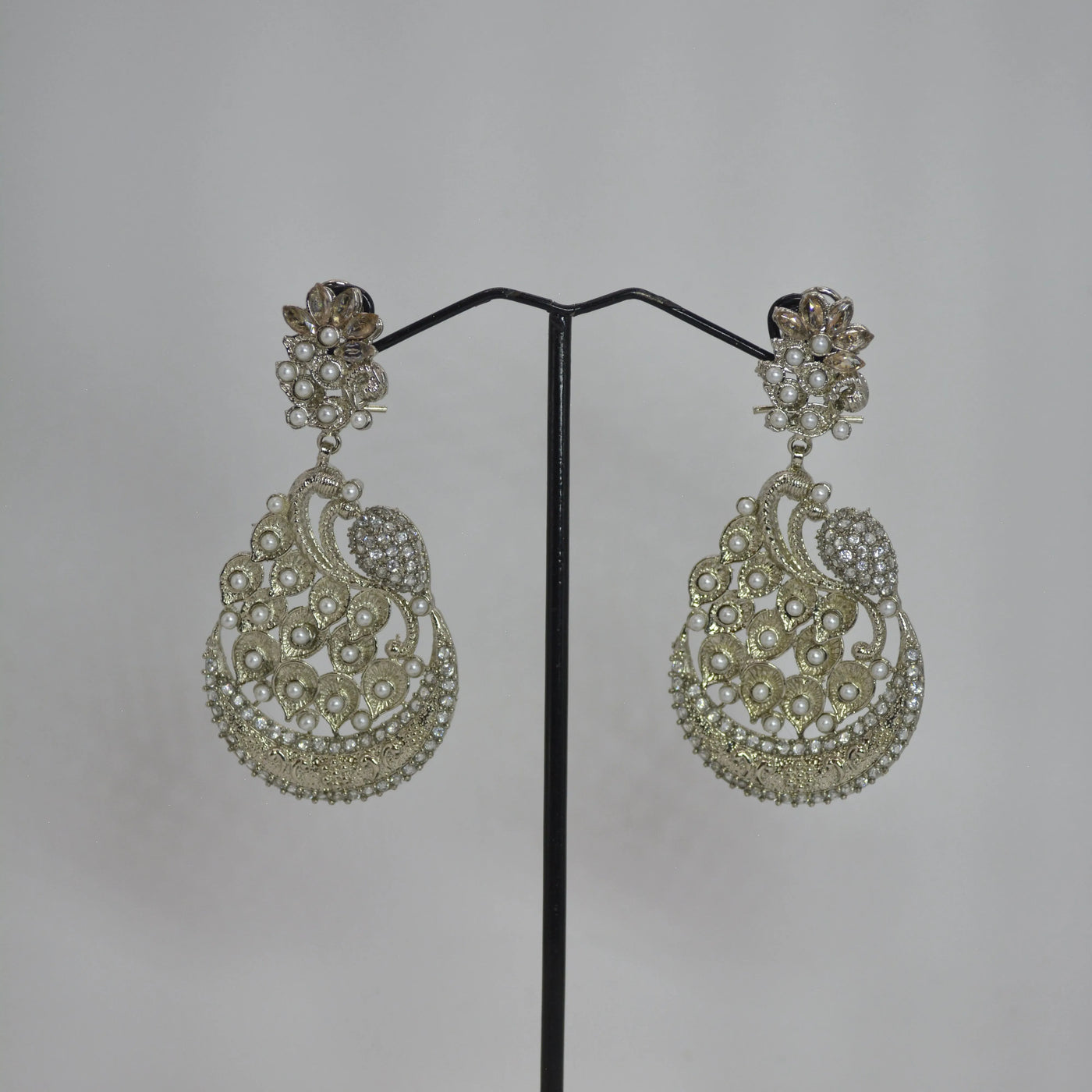 The lower part of the earrings has a crescent shape with additional silver and gold embellishments, including a row of small white pearls along the edge. The overall design is ornate and elegant, making these earrings a striking piece of jewelry that is sure to turn heads.
