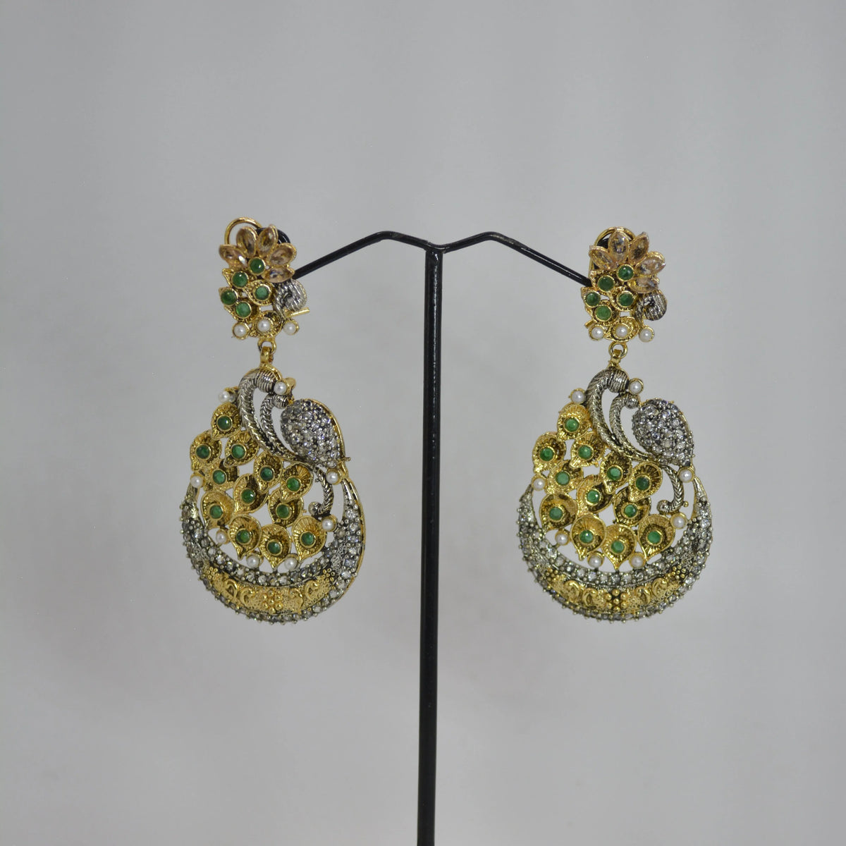 Experience the majesty of peacocks with these exquisite gold-plated earrings from Sovrati Jewelry. The intricate design features a combination of gold and silver tones, with a floral motif on the upper part of each earring, adorned with green stones and small white pearls. The main body of the earrings is shaped like a peacock, with the head and neck adorned with silver and white stones, and the body decorated with green stones and gold detailing.