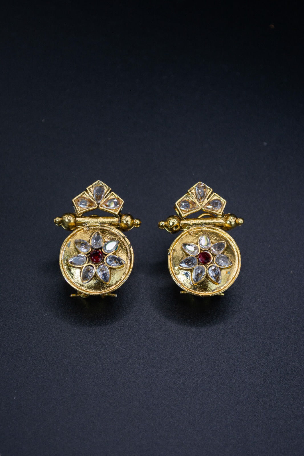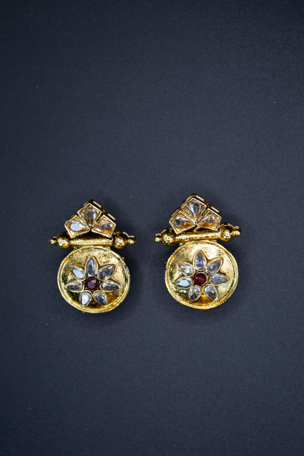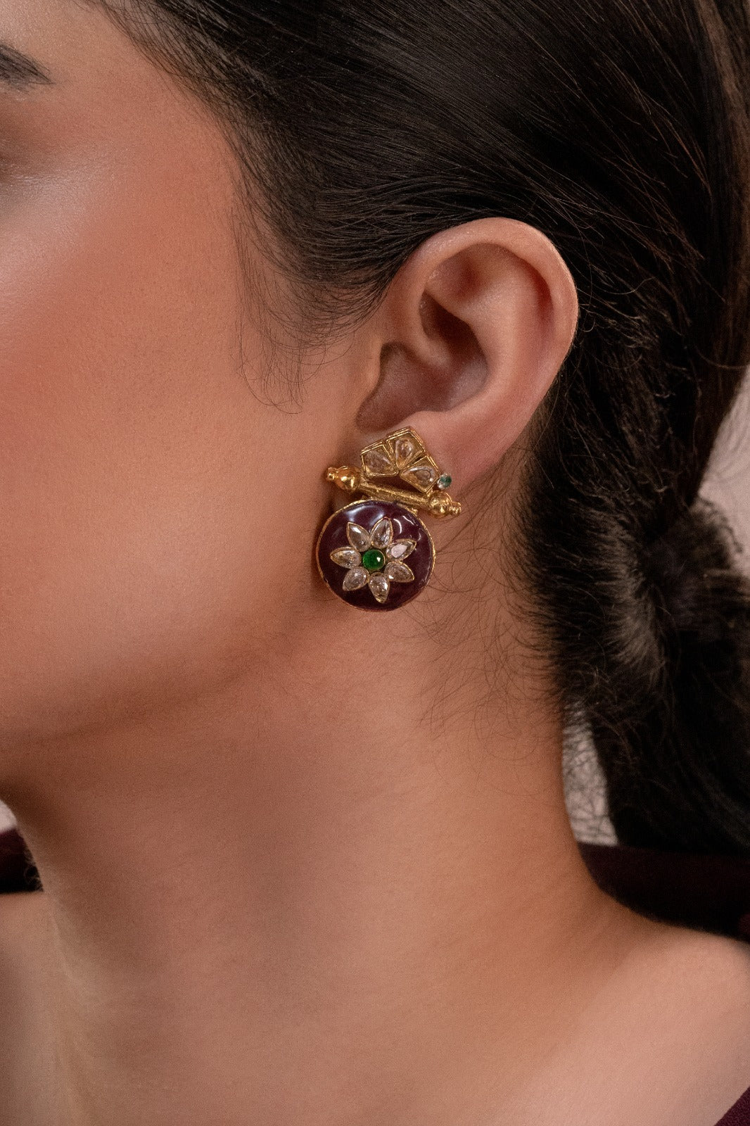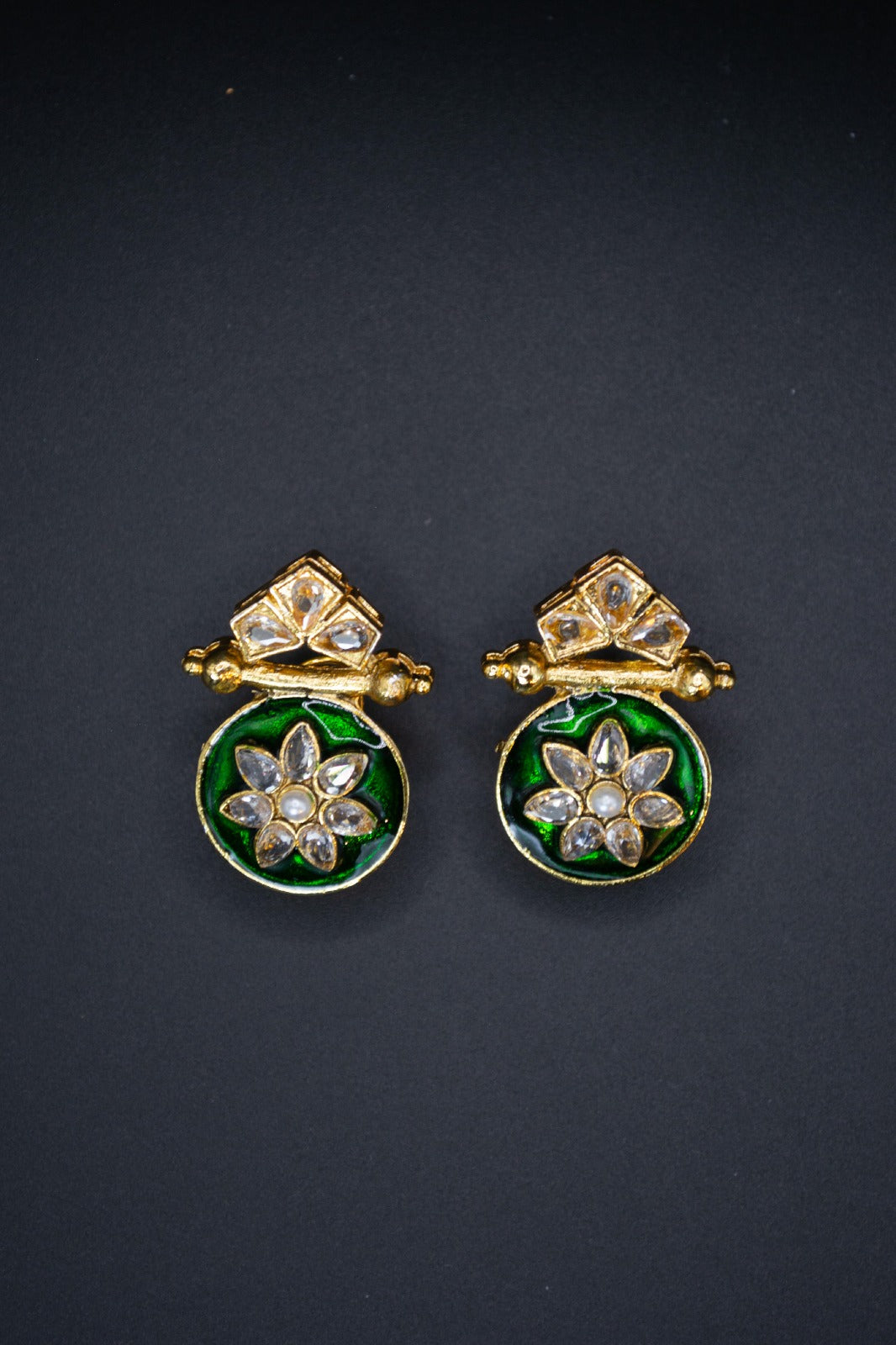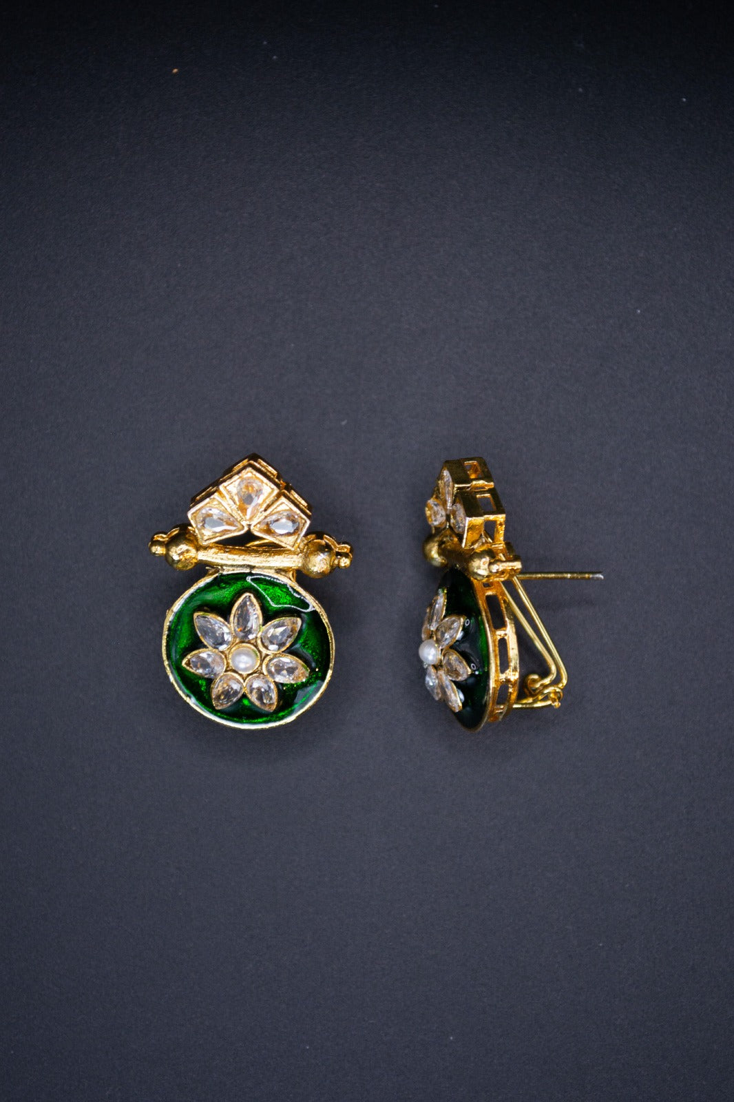gold plated earring, with high quality stones and lacquer in the middle. Manufactured in Pakistan