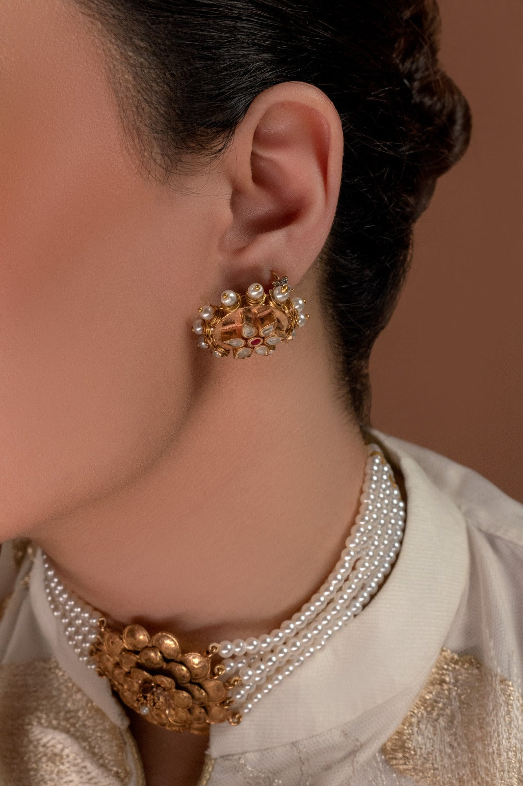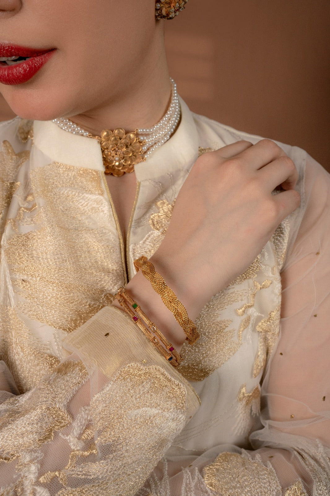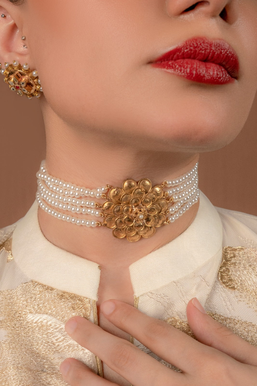a choker neckless high quality piece, 18 k gold plated, with high quality pearls. manufactured in Pakistan