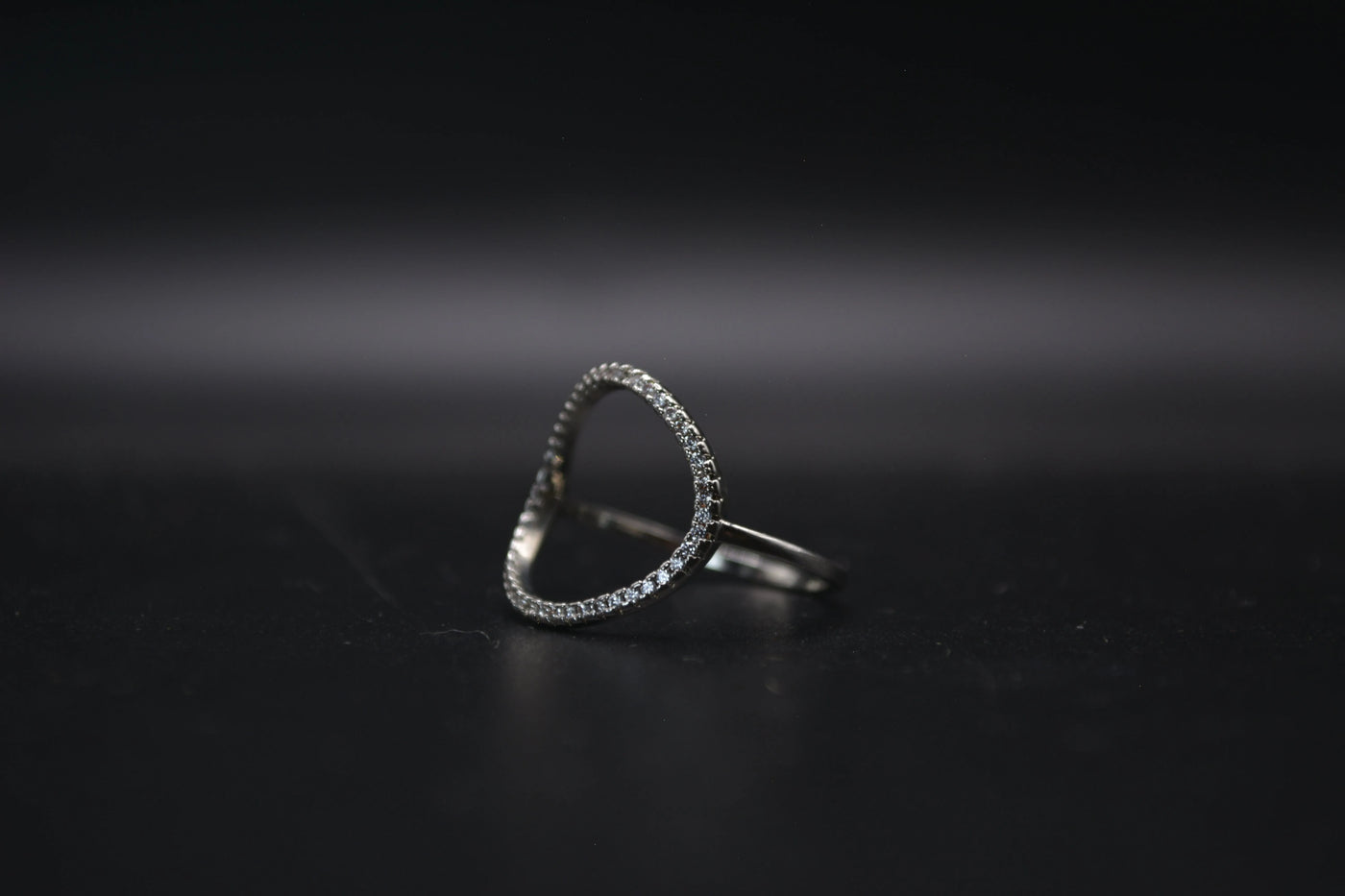 Make a statement with this exquisite circular crystal ring from Sovrati Jewelry, expertly crafted with a unique design and luxurious materials. The ring features a circular outline encrusted with small, sparkling crystals, creating a continuous line of sparkle around the shape. The thin band is made of shiny sterling silver, enhancing the brilliance of the stones.