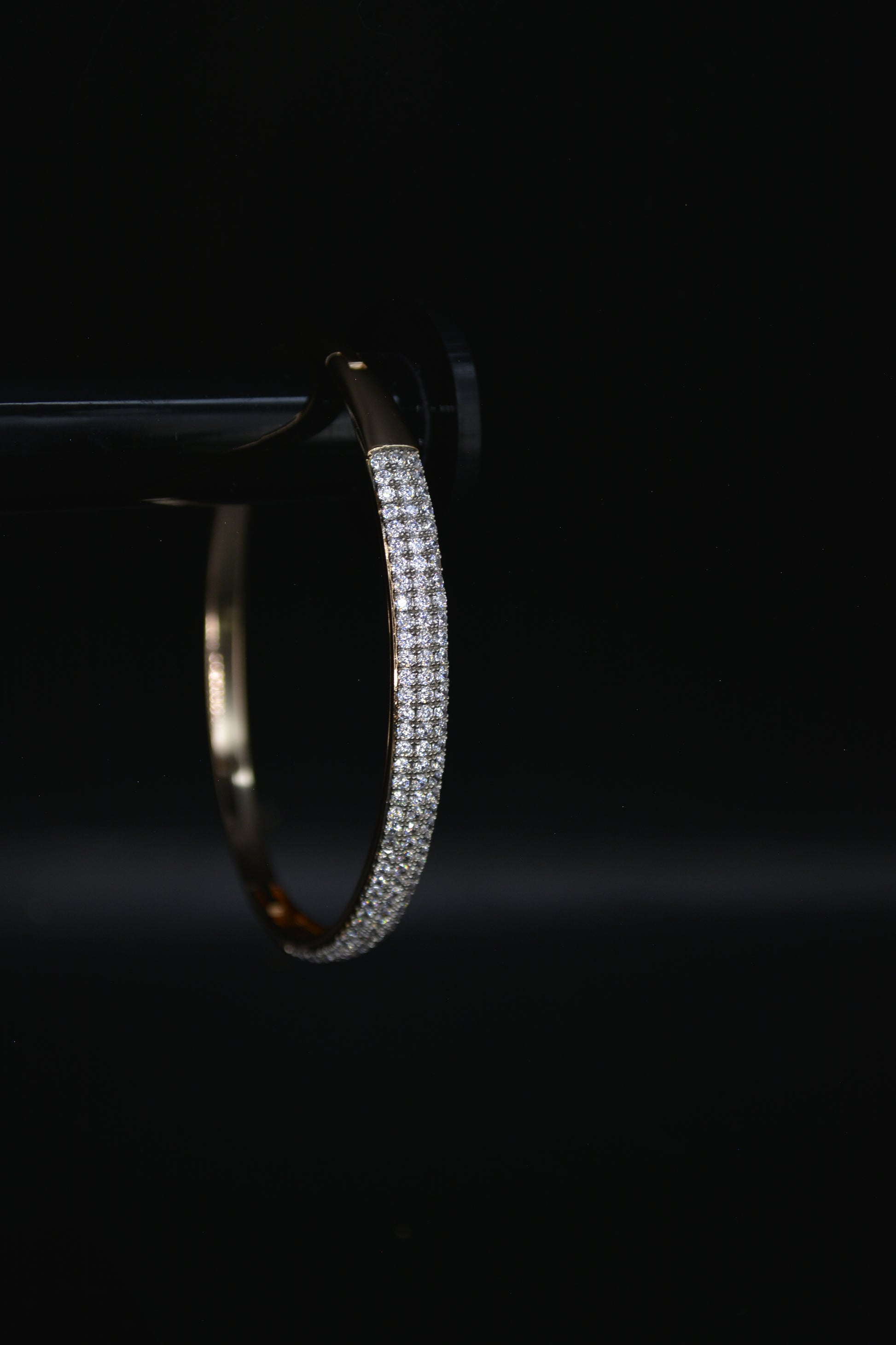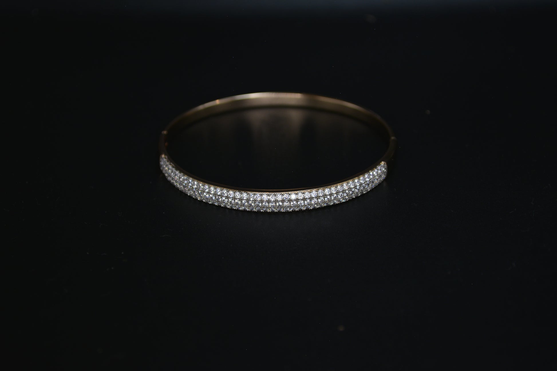 The central part of the bracelet is adorned with multiple rows of small, sparkling crystals. These stones are set closely together, creating a continuous, shimmering effect across the surface of the bracelet. The stones are arranged in a pave setting, which enhances the bracelet's brilliance and luxurious appearance.